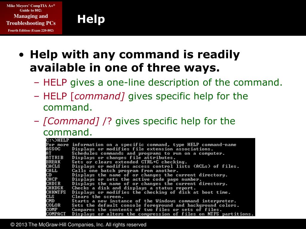 Help Help with any command is readily available in one of three ways. HELP gives a one-line description of the command. HELP [command]gives specific help for the command. [Command] /? gives specific help for the command.