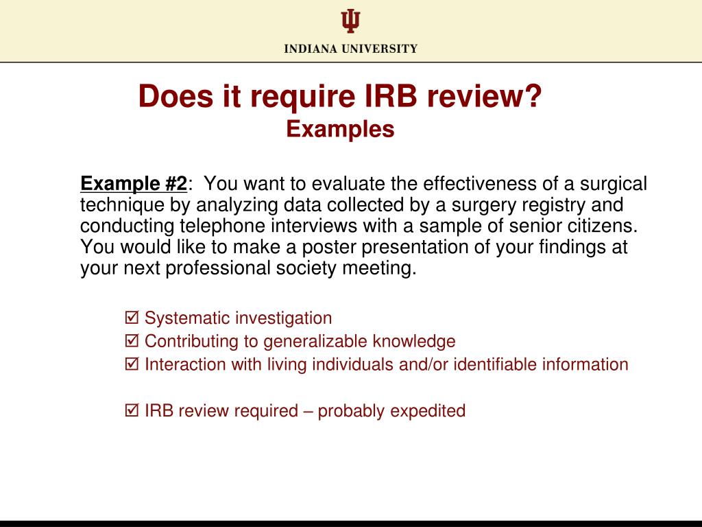 Does it require IRB review?Examples Example #2: You want to evaluate the effectiveness of a surgical technique by analyzing data collected by a surgery registry and conducting telephone interviews with a sample of senior citizens. You would like to make a poster presentation of your findings at your next professional society meeting. Systematic investigation Contributing to generalizable knowledge Interaction with living individuals and/or identifiable information IRB review required – probably expedited