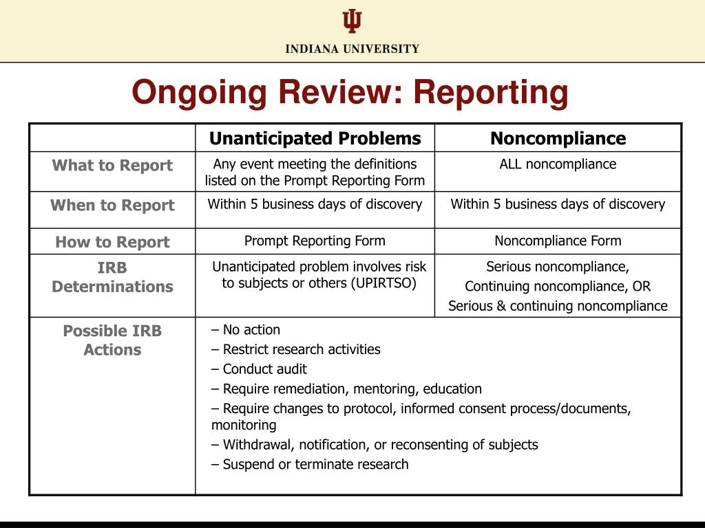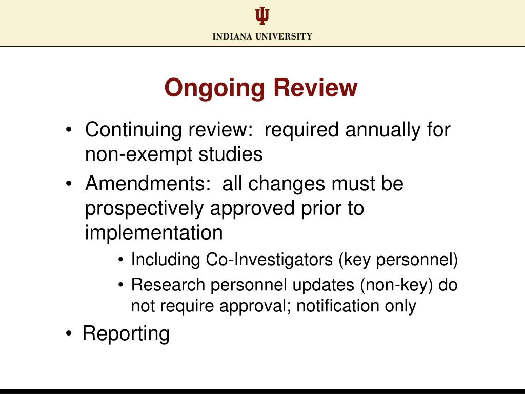 Ongoing Review • Continuing review: required annually for non-exempt studies • Amendments: all changes must be prospectively approved prior to implementation • Including Co-Investigators (key personnel) • Research personnel updates (non-key) do not require approval; notification only • Reporting