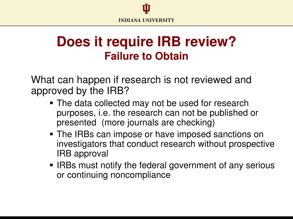 Does it require IRB review? Failure to Obtain What can happen if research is not reviewed and approved by the IRB? • The data collected may not be used for research purposes, i.e. the research can not be published or presented (more journals are checking) • The IRBs can impose or have imposed sanctions on investigators that conduct research without prospective IRB approval • IRBs must notify the federal government of any serious or continuing noncompliance