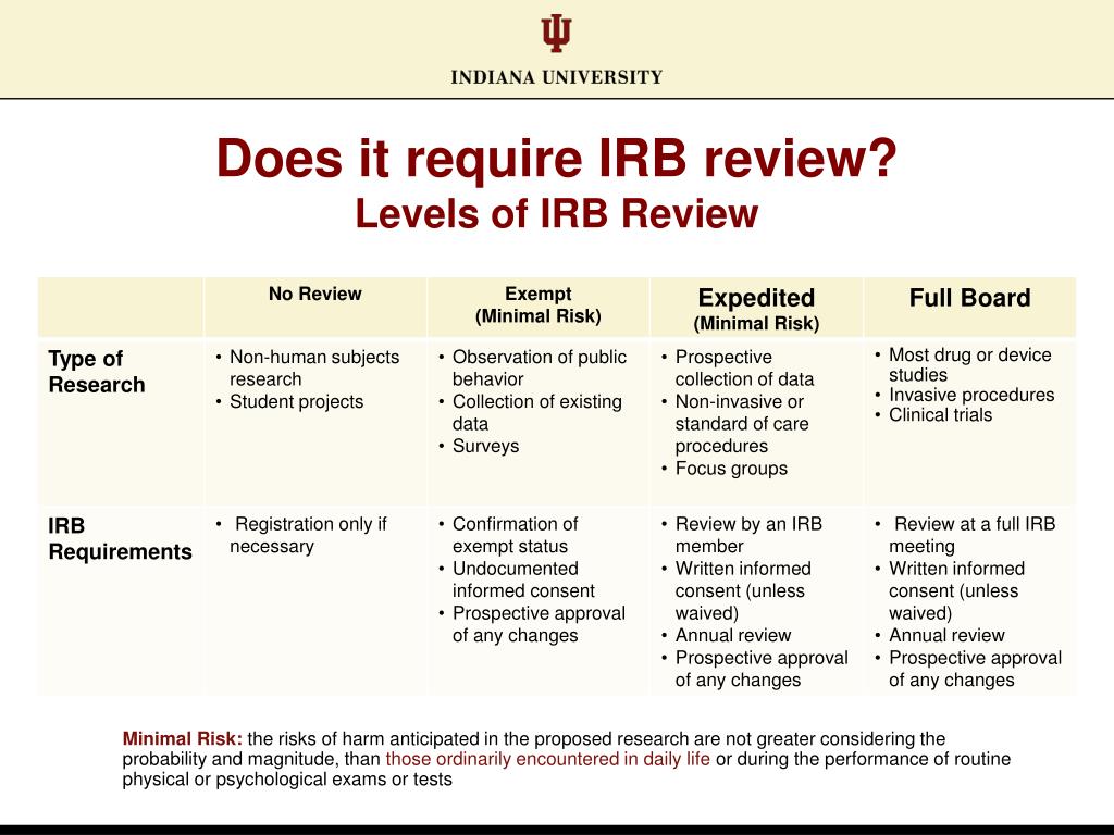 Does it require IRB review? Levels of IRB Review Minimal Risk: the risks of harm anticipated in the proposed research are not greater considering the probability and magnitude, than those ordinarily encountered in daily life or during the performance of routine physical or psychological exams or tests