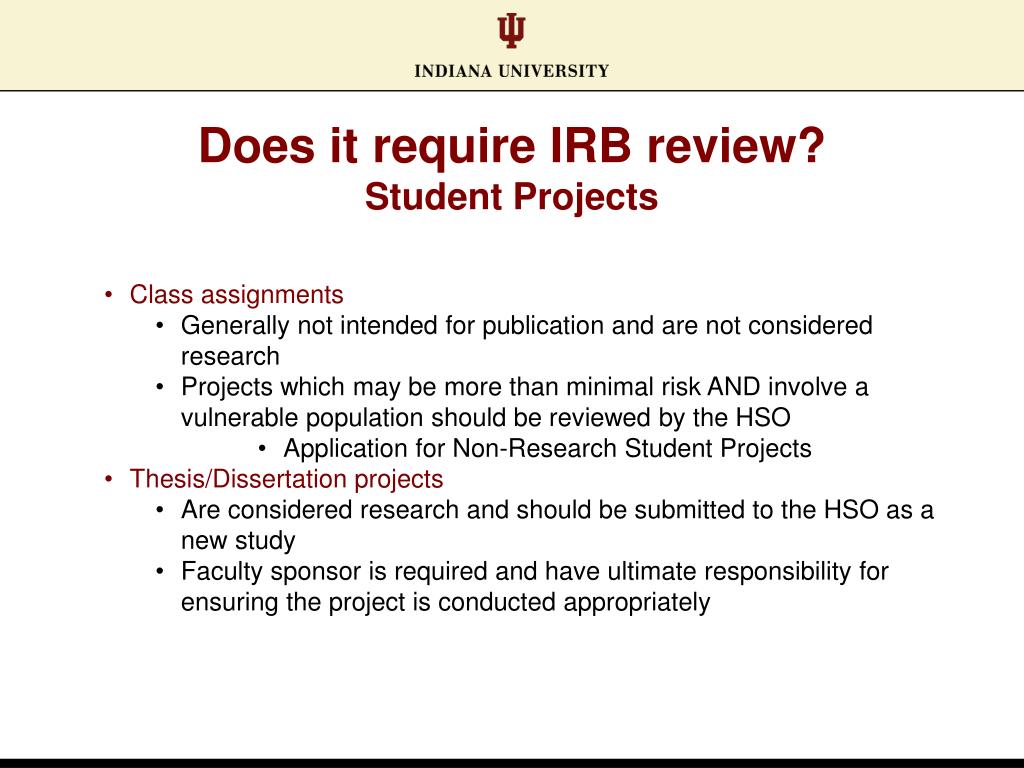 Does it require IRB review? Student Projects • Class assignments • Generally not intended for publication and are not considered research • Projects which may be more than minimal risk AND involve a vulnerable population should be reviewed by the HSO • Application for Non-Research Student Projects • Thesis/Dissertation projects • Are considered research and should be submitted to the HSO as a new study • Faculty sponsor is required and have ultimate responsibility for ensuring the project is conducted appropriately