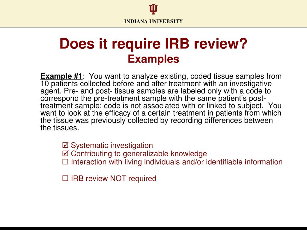 Does it require IRB review? Examples Example #1: You want to analyze existing, coded tissue samples from 10 patients collected before and after treatment with an investigative agent. Pre- and post- tissue samples are labeled only with a code to correspond the pre-treatment sample with the same patient’s post-treatment sample; code is not associated with or linked to subject. You want to look at the efficacy of a certain treatment in patients from which the tissue was previously collected by recording differences between the tissues. Systematic investigation Contributing to generalizable knowledge Interaction with living individuals and/or identifiable information IRB review NOT required