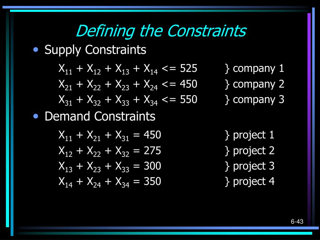 Defining the Constraints • Supply Constraints X11 + X12 + X13 + X14 <= 525 } company 1 X21 + X22 + X23 + X24 <= 450 } company 2 X31 + X32 + X33 + X34 <= 550 } company 3 • Demand Constraints X11 + X21 + X31 = 450 } project 1 X12 + X22 + X32 = 275 } project 2 X13 + X23 + X33 = 300 } project 3 X14 + X24 + X34 = 350 } project 4