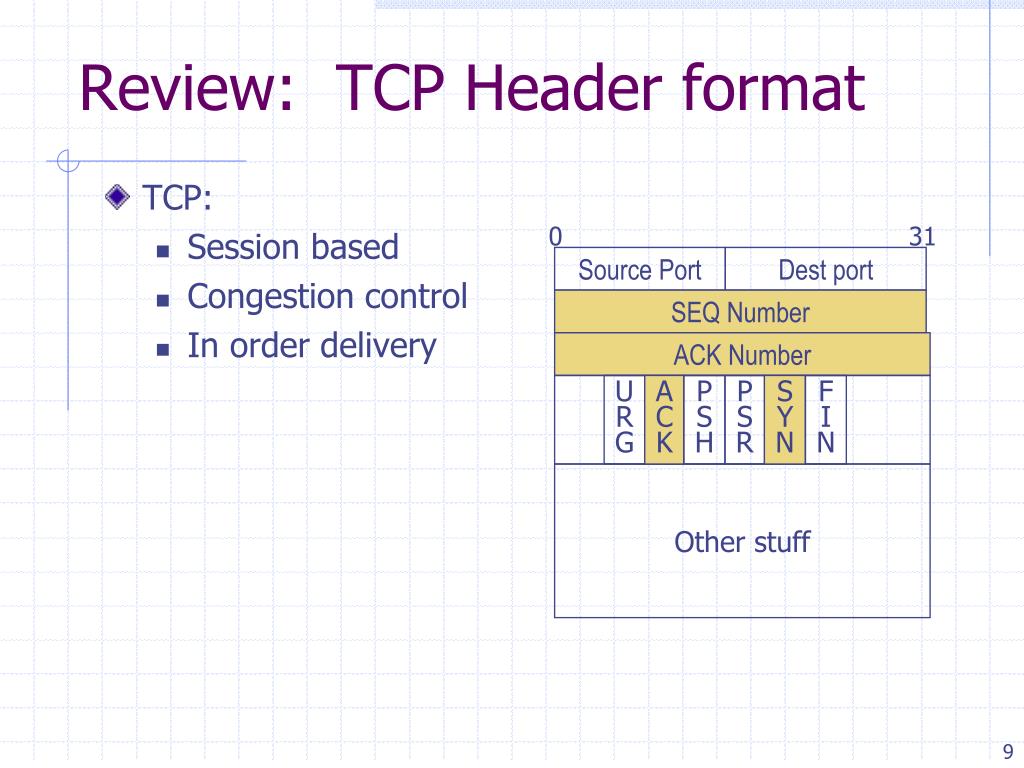 TCP: Session based Congestion control In order delivery 0 31 Source Port Dest port SEQ Number ACK Number U R G A C K P S H P S R S Y N F I N Other stuff Review: TCP Header format