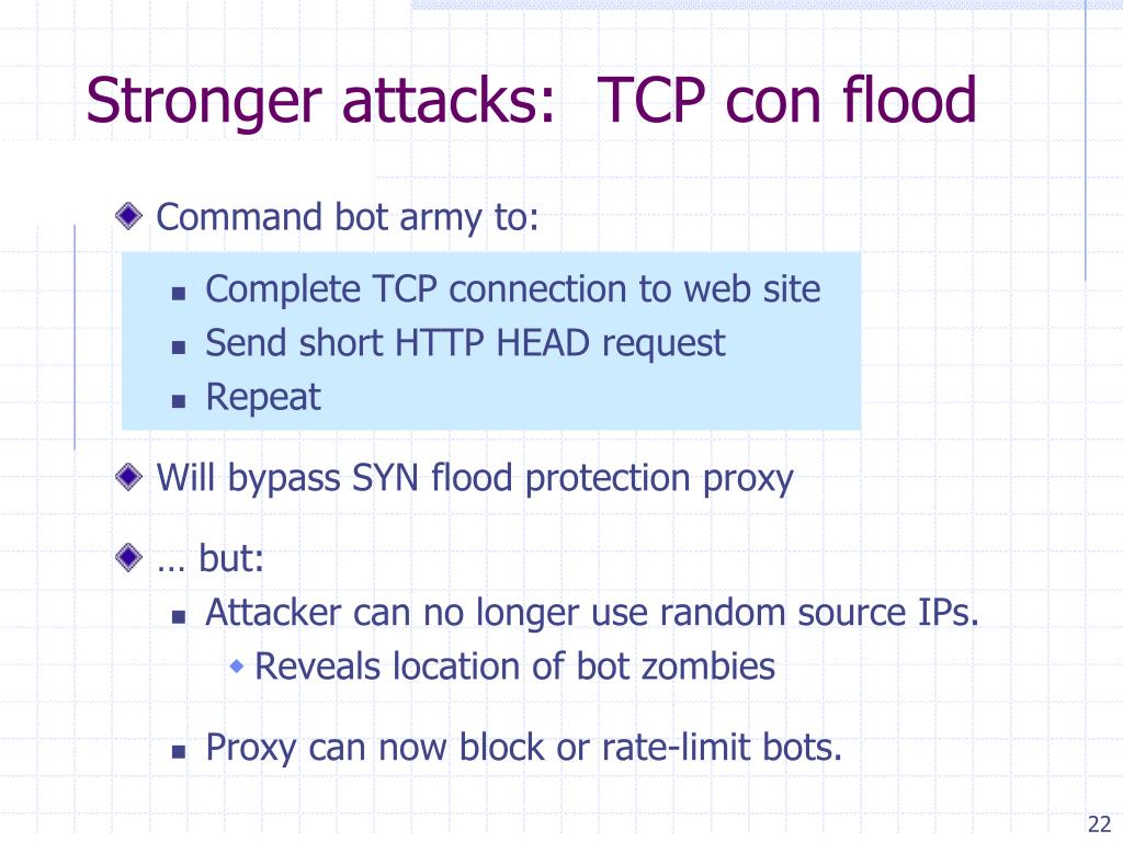 Stronger attacks: TCP con flood • Command bot army to: • Complete TCP connection to web site • Send short HTTP HEAD request • Repeat • Will bypass SYN flood protection proxy • … but: • Attacker can no longer use random source IPs. • Reveals location of bot zombies • Proxy can now block or rate-limit bots.