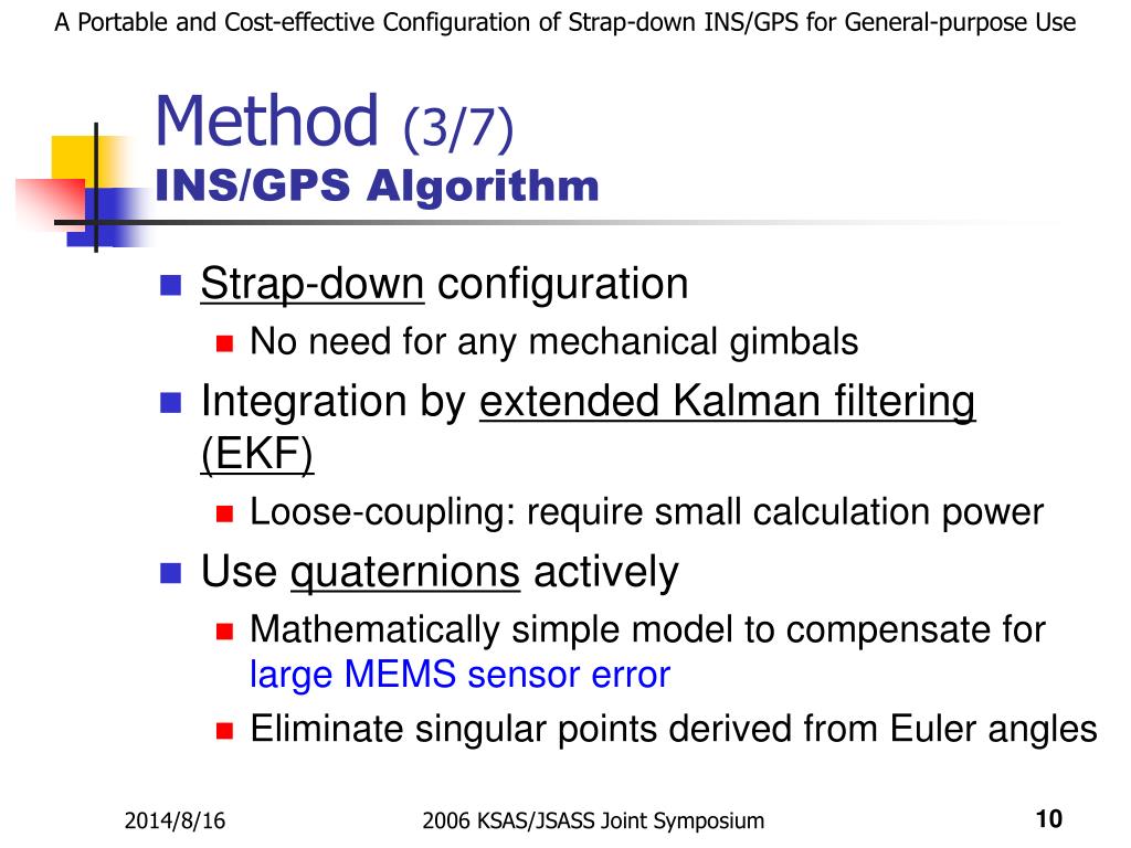 Method (3/7)INS/GPS Algorithm • Strap-down configuration • No need for any mechanical gimbals • Integration by extended Kalman filtering (EKF) • Loose-coupling: require small calculation power • Use quaternions actively • Mathematically simple model to compensate for large MEMS sensor error • Eliminate singular points derived from Euler angles 2006 KSAS/JSASS Joint Symposium