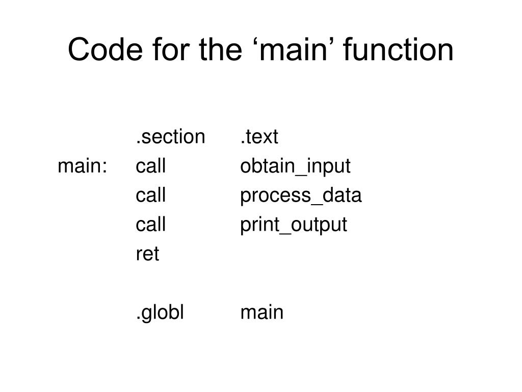 Code for the ‘main’ function .section .text main: call obtain_input call process_data call print_output ret .globl main