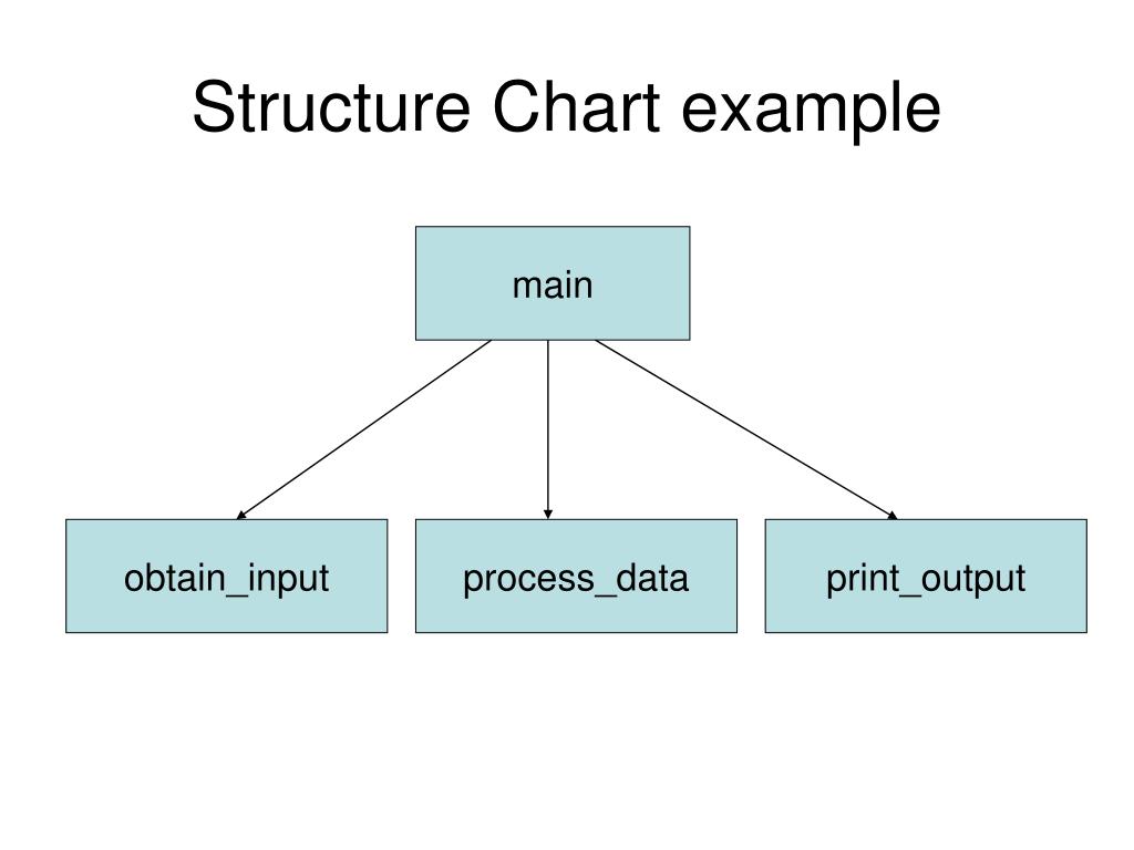 Structured programming • A discipline for faster program design • Idea: break a big task into simple pieces • It’s known as “task decomposition” • We can use a diagram to illustrate it • Diagram is called a “Structure Chart”