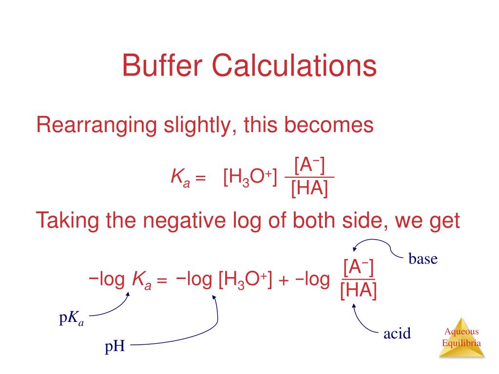 [A−] [HA] [H3O+] Ka = base [A−] [HA] −log [H3O+] + −log −log Ka = pKa acid pH Buffer Calculations Rearranging slightly, this becomes Taking the negative log of both side, we get