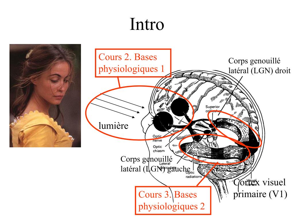 Cours 2. Bases physiologiques 1 Cours 3. Bases physiologiques 2 Intro Corps genouillé latéral (LGN) droit lumière Corps genouillé latéral (LGN) gauche Cortex visuel primaire (V1)