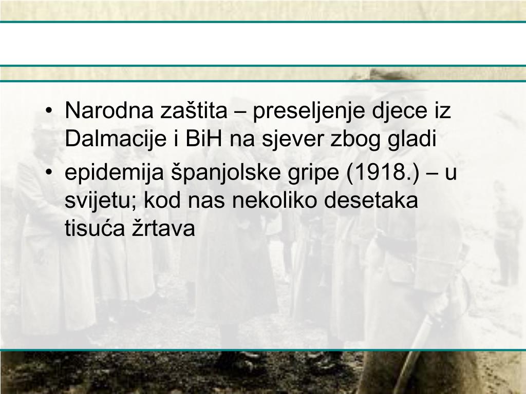Narodna zaštita – preseljenje djece iz Dalmacije i BiH na sjever zbog gladi • epidemija španjolske gripe (1918.) – u svijetu; kod nas nekoliko desetaka tisuća žrtava