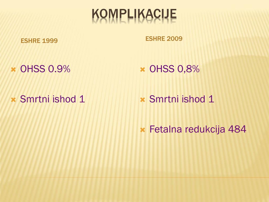ESHRE 1999 ESHRE 2009 • OHSS 0.9% • Smrtni ishod 1 • OHSS 0,8% • Smrtni ishod 1 • Fetalna redukcija 484 KOMPLIKACIJE