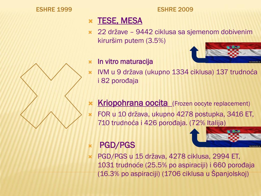 ESHRE 1999 ESHRE 2009 • TESE, MESA • 22 države – 9442 ciklusa sa sjemenom dobivenim kiruršim putem (3.5%) • In vitro maturacija • IVM u 9 država (ukupno 1334 ciklusa) 137 trudnoća i 82 porođaja • Kriopohrana oocita (Frozen oocyte replacement) • FOR u 10 država, ukupno 4278 postupka, 3416 ET, 710 trudnoća i 426 porođaja. (72% Italija) • PGD/PGS • PGD/PGS u 15 država, 4278 ciklusa, 2994 ET, 1031 trudnoće (25.5% po aspiraciji) i 660 porođaja (16.3% po aspiraciji) (1706 ciklusa u Španjolskoj)