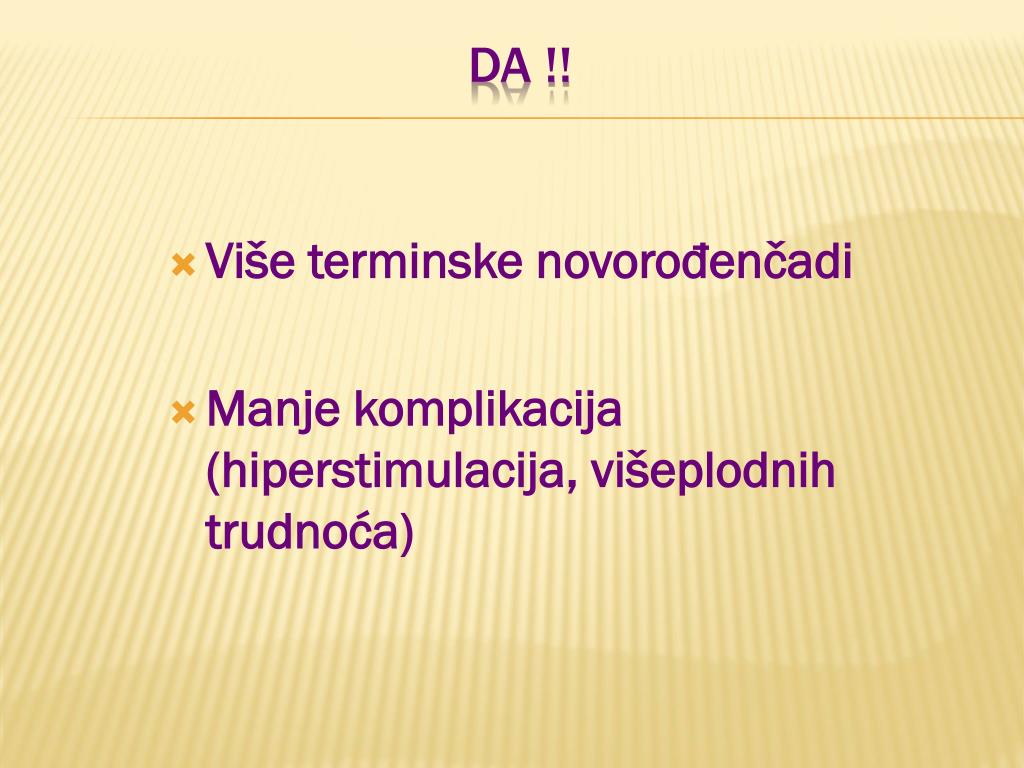 Više terminske novorođenčadi Manje komplikacija (hiperstimulacija, višeplodnih trudnoća) DA !!