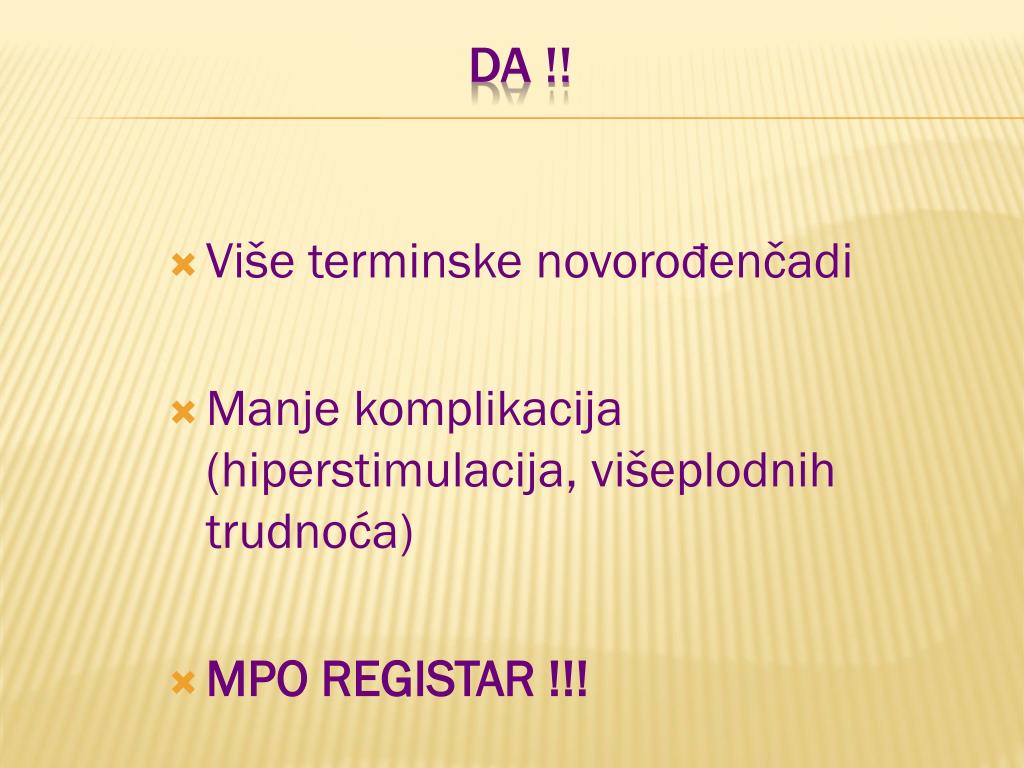 Više terminske novorođenčadi Manje komplikacija (hiperstimulacija, višeplodnih trudnoća) MPO REGISTAR !!! DA !!