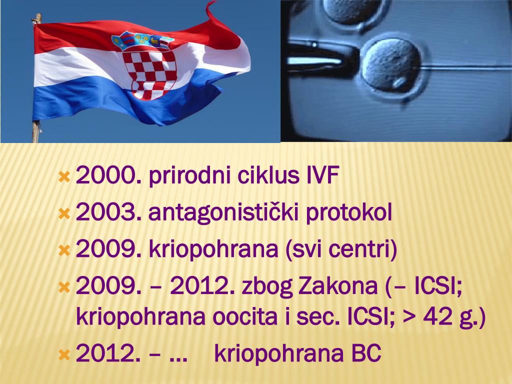 2000. prirodni ciklus IVF 2003. antagonistički protokol 2009. kriopohrana (svi centri) 2009. – 2012. zbog Zakona (– ICSI; kriopohrana oocita i sec. ICSI; > 42 g.) 2012. – ... kriopohrana BC