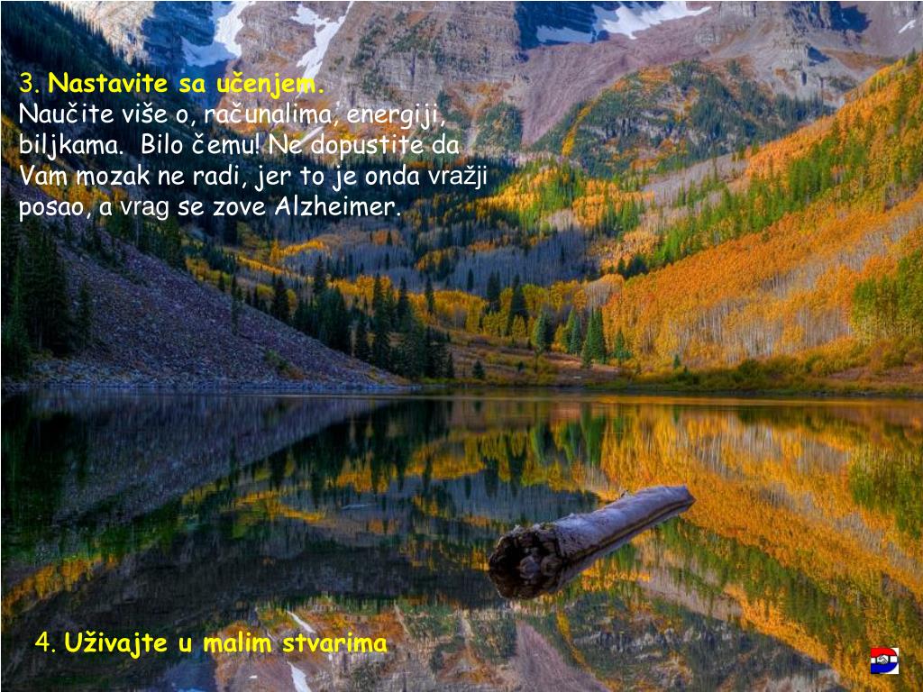 3. Nastavite sa učenjem. Naučite više o, računalima, energiji, biljkama. Bilo čemu! Ne dopustite da Vam mozak ne radi, jer to je onda vražji posao, a vrag se zove Alzheimer. 4. Uživajte u malim stvarima