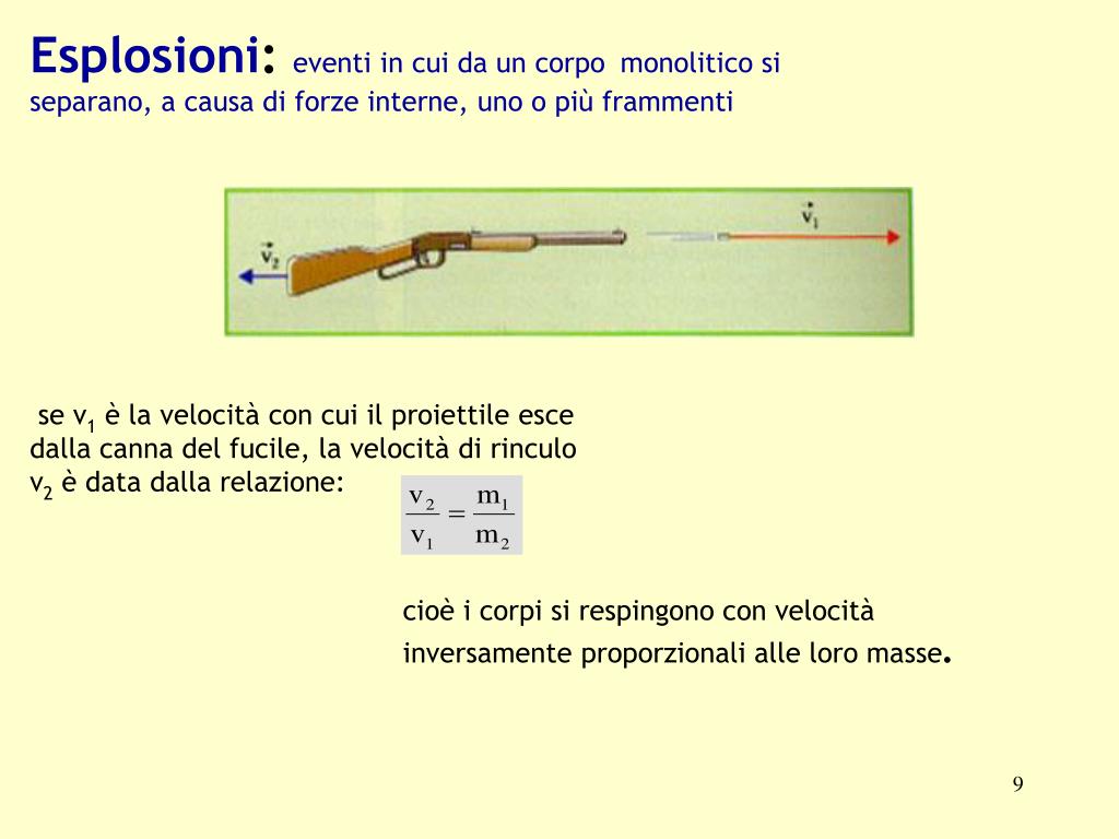 Esplosioni: eventi in cui da un corpomonolitico si separano, a causa di forze interne, uno o più frammenti se v1 è la velocità con cui il proiettile esce dalla canna del fucile, la velocità di rinculo v2 è data dalla relazione: cioè i corpi si respingono con velocità inversamente proporzionali alle loro masse.
