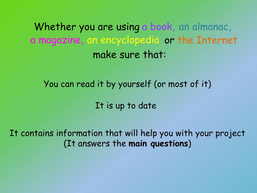 Whether you are using a book, an almanac, a magazine, an encyclopedia or the Internet make sure that: You can read it by yourself (or most of it) It is up to date It contains information that will help you with your project (It answers the main questions)