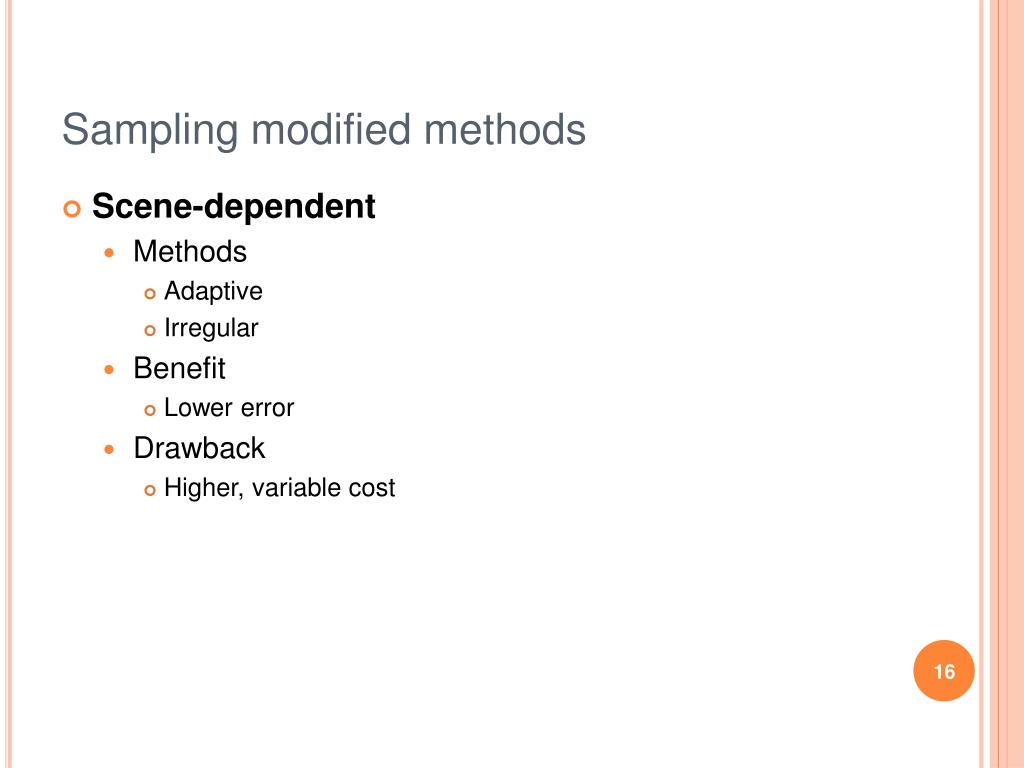Sampling modified methods • Scene-dependent • Methods • Adaptive • Irregular • Benefit • Lower error • Drawback • Higher, variable cost