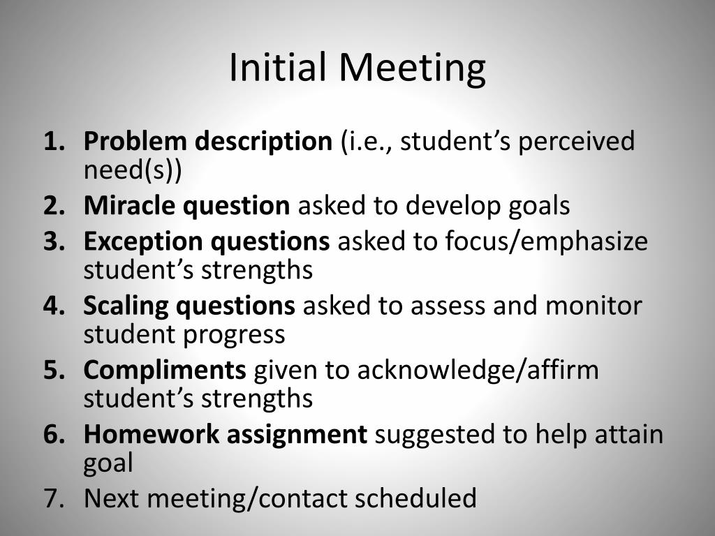 Initial Meeting • Problem description (i.e., student’s perceived need(s)) • Miracle question asked to develop goals • Exception questions asked to focus/emphasize student’s strengths • Scaling questions asked to assess and monitor student progress • Complimentsgiven to acknowledge/affirm student’s strengths • Homework assignment suggested to help attain goal • Next meeting/contact scheduled