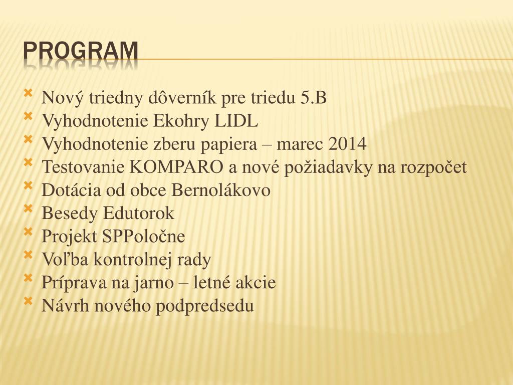 Nový triedny dôverník pre triedu 5.B Vyhodnotenie Ekohry LIDL Vyhodnotenie zberu papiera – marec 2014 Testovanie KOMPARO a nové požiadavky na rozpočet Dotácia od obce Bernolákovo Besedy Edutorok Projekt SPPoločne Voľba kontrolnej rady Príprava na jarno – letné akcie Návrh nového podpredsedu program