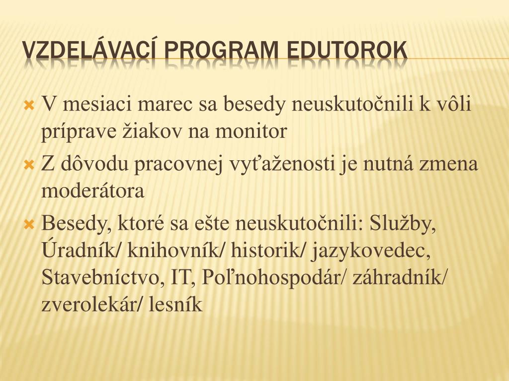V mesiaci marec sa besedy neuskutočnili k vôli príprave žiakov na monitor Z dôvodu pracovnej vyťaženosti je nutná zmena moderátora Besedy, ktoré sa ešte neuskutočnili: Služby, Úradník/ knihovník/ historik/ jazykovedec, Stavebníctvo, IT, Poľnohospodár/ záhradník/ zverolekár/ lesník Vzdelávací program Edutorok