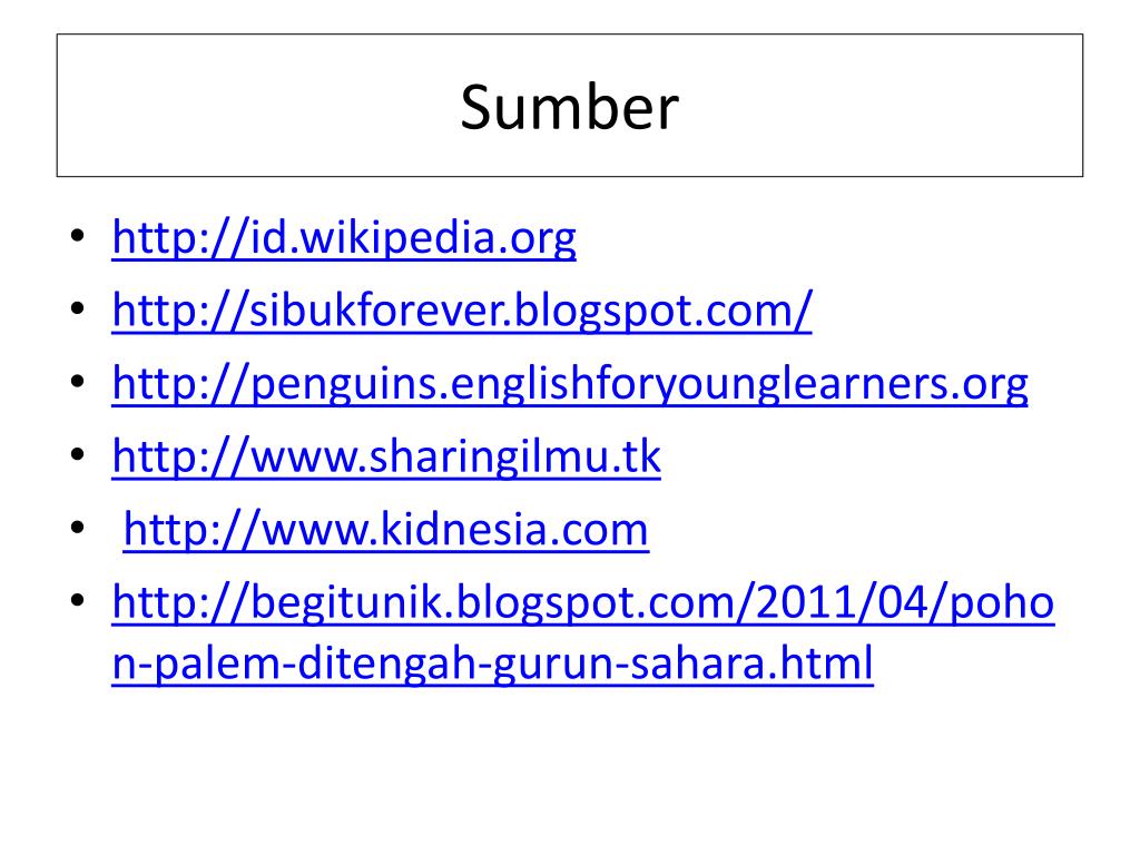 Sumber • http://id.wikipedia.org • http://sibukforever.blogspot.com/ • http://penguins.englishforyounglearners.org • http://www.sharingilmu.tk • http://www.kidnesia.com • http://begitunik.blogspot.com/2011/04/pohon-palem-ditengah-gurun-sahara.html