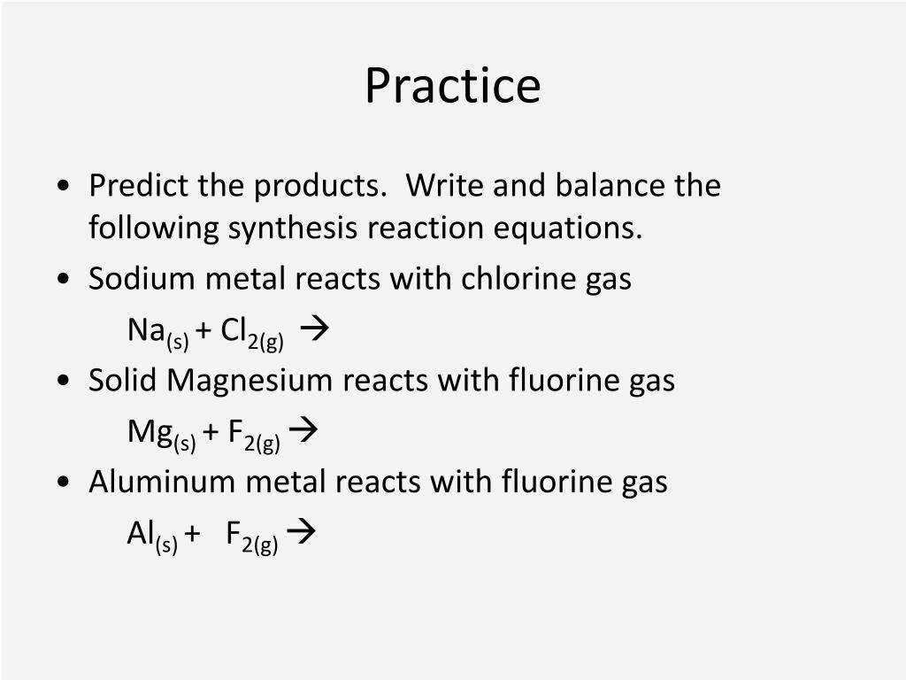 Practice • Predict the products. Write and balance the following synthesis reaction equations. • Sodium metal reacts with chlorine gas Na(s) + Cl2(g) • Solid Magnesium reacts with fluorine gas Mg(s) + F2(g) • Aluminum metal reacts with fluorine gas Al(s) + F2(g)