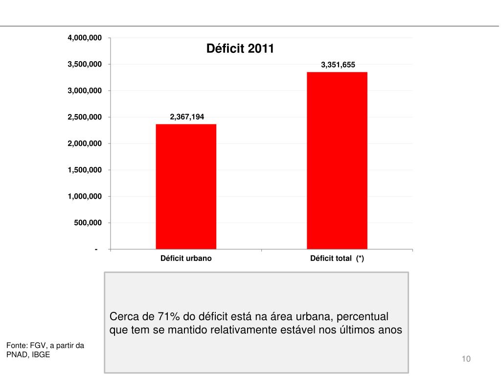 Déficit 2011 Cerca de 71% do déficit está na área urbana, percentual que tem se mantido relativamente estável nos últimos anos Fonte: FGV, a partir da PNAD, IBGE