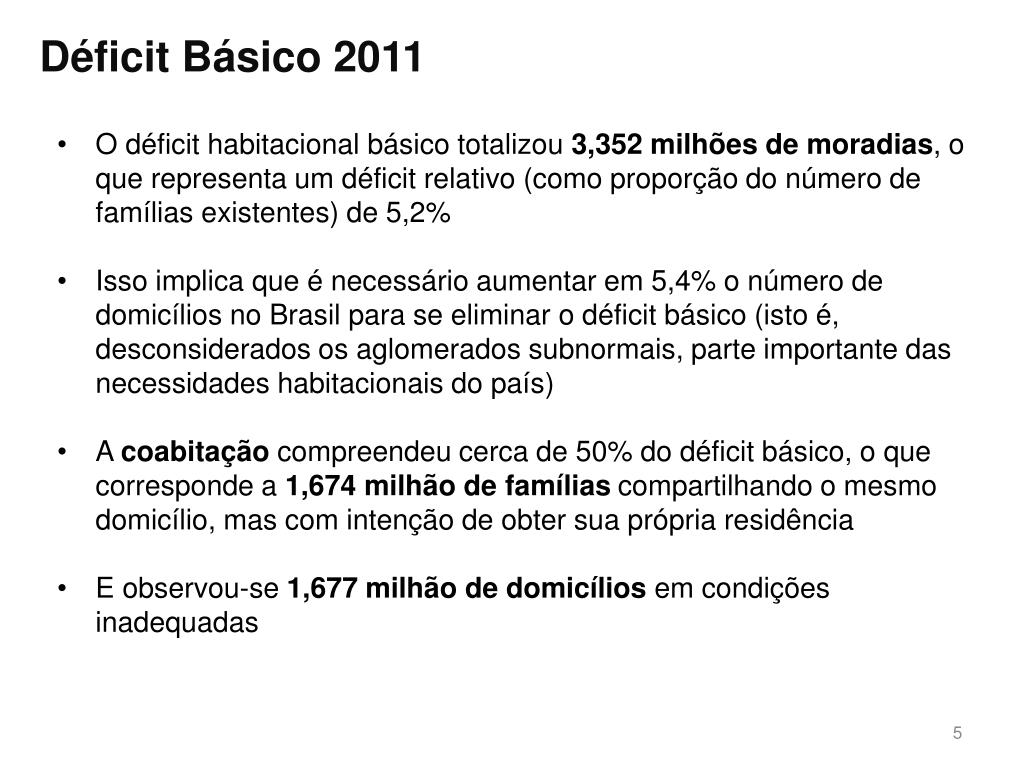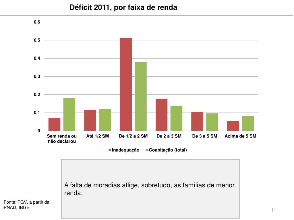 Déficit 2011 Como ficaria o déficit habitacional com a inclusão dos aglomerados subnormais: A estimativa realizada pela FGV a partir da PNAD 2009 indicou 2,065 milhões de unidades em aglomerados subnormais. Se esse número for mantido constante, o déficit total chega a 5,355 milhões de domicílios. No entanto, nos últimos anos (2007 a 2009), os aglomerados representaram em média 3,5% do total de domicílios do país. Se esse percentual for mantido em 2011, o total de aglomerados seria 2,175 milhões e o déficit atingiria 5,461 milhões de famílias.