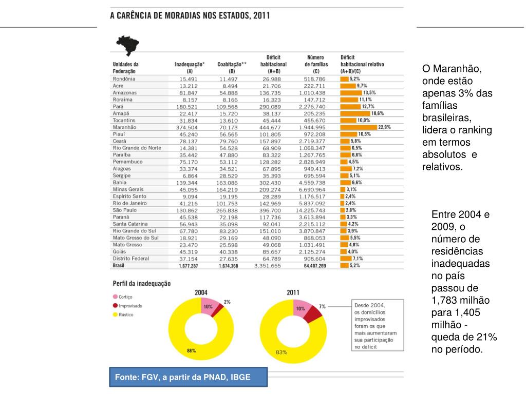 O Maranhão, onde estão apenas 3% das famílias brasileiras, lidera oranking em termos absolutos e relativos. Entre 2004 e 2009, o número de residências inadequadas no país passou de 1,783 milhão para 1,405 milhão - queda de 21% no período. Fonte: FGV, a partir da PNAD, IBGE