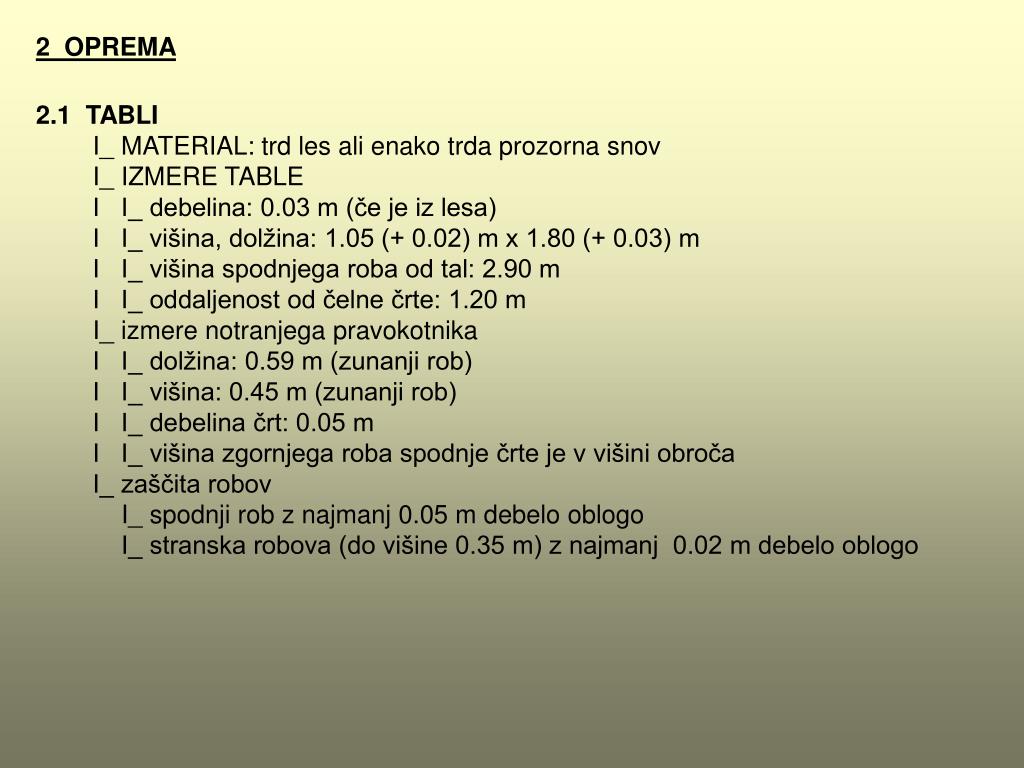 2 OPREMA 2.1 TABLI I_ MATERIAL: trd les ali enako trda prozorna snov I_ IZMERE TABLE I I_ debelina: 0.03 m (če je iz lesa) I I_ višina, dolžina: 1.05 (+ 0.02) m x 1.80 (+ 0.03) m I I_ višina spodnjega roba od tal: 2.90 m I I_ oddaljenost od čelne črte: 1.20 m I_ izmere notranjega pravokotnika I I_ dolžina: 0.59 m (zunanji rob) I I_ višina: 0.45 m (zunanji rob) I I_ debelina črt: 0.05 m I I_ višina zgornjega roba spodnje črte je v višini obroča I_ zaščita robov I_ spodnji rob z najmanj 0.05 m debelo oblogo I_ stranska robova (do višine 0.35 m) z najmanj 0.02 m debelo oblogo