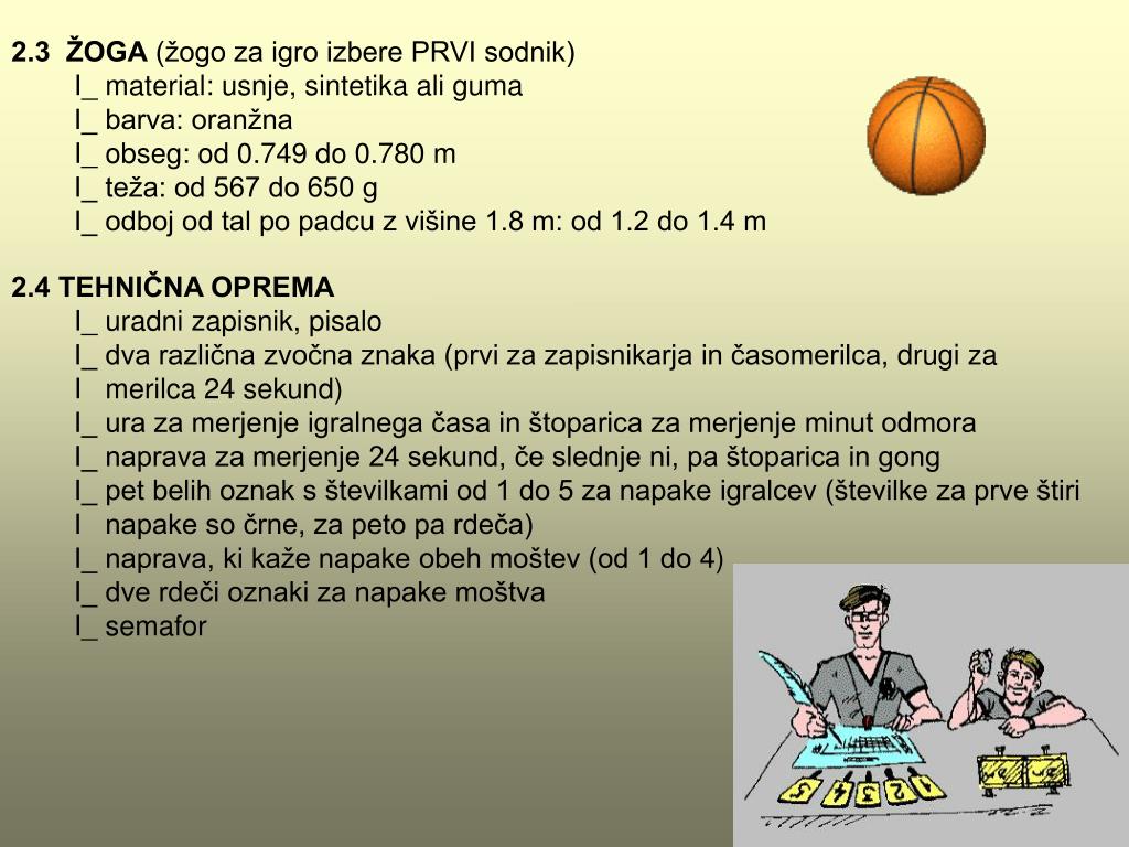 2.3 ŽOGA (žogo za igro izbere PRVI sodnik) I_material: usnje, sintetika ali guma I_ barva: oranžna I_ obseg: od 0.749 do 0.780 m I_ teža: od 567 do 650 g I_ odboj od tal po padcu z višine 1.8 m: od 1.2 do 1.4 m 2.4 TEHNIČNA OPREMA I_ uradni zapisnik, pisalo I_ dva različna zvočna znaka (prvi za zapisnikarja in časomerilca,drugi za I merilca 24 sekund) I_ ura za merjenje igralnega časa in štoparica za merjenje minut odmora I_ naprava za merjenje 24 sekund, če slednje ni, pa štoparica in gong I_ pet belih oznak s številkami od 1 do 5 za napake igralcev (številke za prve štiri I napake so črne, za peto pa rdeča) I_ naprava, ki kaže napake obeh moštev (od 1 do 4) I_ dve rdeči oznaki za napake moštva I_ semafor