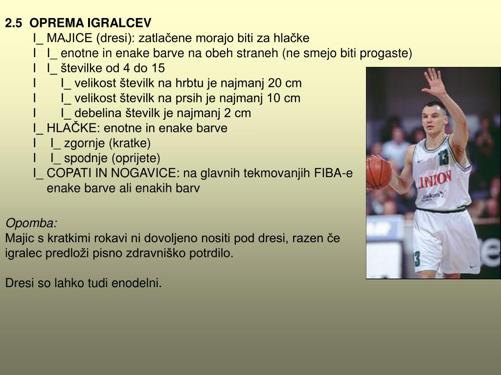 2.5 OPREMA IGRALCEV I_ MAJICE (dresi): zatlačene morajo biti za hlačke I I_ enotne in enake barve na obeh straneh (ne smejo biti progaste) I I_ številke od 4 do 15 I I_ velikost številk na hrbtu je najmanj 20 cm I I_ velikost številk na prsih je najmanj 10 cm I I_ debelina številk je najmanj 2 cm I_ HLAČKE: enotne in enake barve I I_ zgornje (kratke) I I_ spodnje (oprijete) I_ COPATI IN NOGAVICE: na glavnih tekmovanjih FIBA-e enake barve ali enakih barv Opomba: Majic s kratkimi rokavi ni dovoljeno nositi pod dresi, razen če igralec predloži pisno zdravniško potrdilo. Dresi so lahko tudi enodelni.
