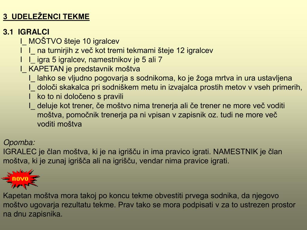 3 UDELEŽENCI TEKME 3.1 IGRALCI I_ MOŠTVO šteje 10 igralcev I I_ na turnirjih z več kot tremi tekmami šteje 12 igralcev I I_ igra 5 igralcev, namestnikov je 5 ali 7 I_ KAPETAN je predstavnik moštva I_ lahko se vljudno pogovarja s sodnikoma, ko je žoga mrtva in ura ustavljena I_ določi skakalca pri sodniškem metu in izvajalca prostih metov v vseh primerih, I ko to ni določeno s pravili I_ deluje kot trener, če moštvo nima trenerja ali če trener ne more več voditi moštva, pomočnik trenerja pa ni vpisan v zapisnik oz. tudi ne more več voditi moštva Opomba: IGRALEC je član moštva, ki je na igrišču in ima pravico igrati. NAMESTNIK je član moštva, ki je zunaj igrišča ali na igrišču, vendar nima pravice igrati. Kapetan moštva mora takoj po koncu tekme obvestiti prvega sodnika, da njegovo moštvo ugovarja rezultatu tekme. Prav tako se mora podpisati v za to ustrezen prostor na dnu zapisnika.