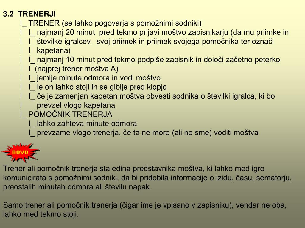 3.2 TRENERJI I_ TRENER (se lahko pogovarja s pomožnimi sodniki) I I_ najmanj 20 minut pred tekmo prijavi moštvo zapisnikarju (da mu priimke in I I številke igralcev, svoj priimek in priimek svojega pomočnika ter označi I I kapetana) I I_ najmanj 10 minut pred tekmo podpiše zapisnik in določi začetno peterko I I (najprej trener moštva A) I I_ jemlje minute odmora in vodi moštvo I I_ le on lahko stoji in se giblje pred klopjo I I_ če je zamenjan kapetan moštva obvesti sodnika o številki igralca, ki bo I prevzel vlogo kapetana I_ POMOČNIK TRENERJA I_ lahko zahteva minute odmora I_ prevzame vlogo trenerja, če ta ne more (ali ne sme) voditi moštva Trener ali pomočnik trenerja sta edina predstavnika moštva, ki lahko med igro komunicirata s pomožnimi sodniki, da bi pridobila informacije o izidu, času, semaforju, preostalih minutah odmora ali številu napak. Samo trener ali pomočnik trenerja (čigar ime je vpisano v zapisniku), vendar ne oba, lahko med tekmo stoji.