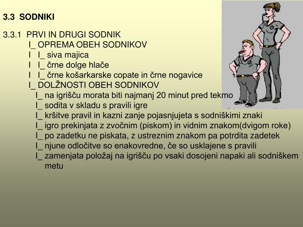 3.3 SODNIKI 3.3.1 PRVI IN DRUGI SODNIK I_ OPREMA OBEH SODNIKOV I I_ siva majica I I_ črne dolge hlače I I_ črne košarkarske copate in črne nogavice I_ DOLŽNOSTI OBEH SODNIKOV I_ na igrišču morata biti najmanj 20 minut pred tekmo I_ sodita v skladu s pravili igre I_ kršitve pravil in kazni zanje pojasnjujeta s sodniškimi znaki I_ igro prekinjata z zvočnim (piskom) in vidnim znakom(dvigom roke) I_ po zadetku ne piskata, z ustreznim znakom pa potrdita zadetek I_ njune odločitve so enakovredne, če so usklajene s pravili I_ zamenjata položaj na igrišču po vsaki dosojeni napaki alisodniškem metu