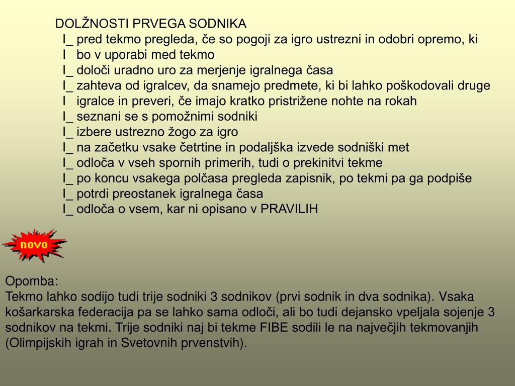 DOLŽNOSTI PRVEGA SODNIKA I_ pred tekmo pregleda, če so pogoji za igro ustrezni in odobri opremo, ki I bo v uporabi med tekmo I_ določi uradno uro za merjenje igralnega časa I_ zahteva od igralcev, da snamejo predmete, ki bi lahko poškodovali druge I igralce in preveri, če imajo kratko pristrižene nohte na rokah I_ seznani se s pomožnimi sodniki I_ izbere ustrezno žogo za igro I_ na začetku vsake četrtine in podaljška izvede sodniški met I_ odloča v vseh spornih primerih, tudi o prekinitvi tekme I_ po koncu vsakega polčasa pregleda zapisnik, po tekmi pa ga podpiše I_ potrdi preostanek igralnega časa I_ odloča o vsem, kar ni opisano v PRAVILIH Opomba: Tekmo lahko sodijo tudi trije sodniki 3 sodnikov (prvi sodnik in dva sodnika). Vsaka košarkarska federacija pa se lahko sama odloči, ali bo tudi dejansko vpeljala sojenje 3 sodnikov na tekmi. Trije sodniki naj bi tekme FIBE sodili le na največjih tekmovanjih (Olimpijskih igrah in Svetovnih prvenstvih).