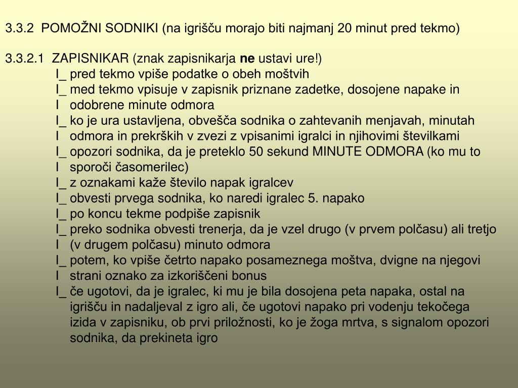 3.3.2 POMOŽNI SODNIKI (na igrišču morajo biti najmanj 20 minut pred tekmo) 3.3.2.1 ZAPISNIKAR (znak zapisnikarja ne ustavi ure!) I_ pred tekmo vpiše podatke o obeh moštvih I_ med tekmo vpisuje v zapisnik priznane zadetke, dosojene napake in I odobrene minute odmora I_ ko je ura ustavljena, obvešča sodnika o zahtevanih menjavah, minutah I odmora in prekrških v zvezi z vpisanimi igralci in njihovimi številkami I_ opozori sodnika, da je preteklo 50 sekund MINUTE ODMORA (ko mu to I sporoči časomerilec) I_ z oznakami kaže število napak igralcev I_ obvesti prvega sodnika, ko naredi igralec 5. napako I_ po koncu tekme podpiše zapisnik I_ preko sodnika obvesti trenerja, da je vzel drugo (v prvem polčasu) ali tretjo I (v drugem polčasu) minuto odmora I_ potem, ko vpiše četrto napako posameznega moštva, dvigne na njegovi I strani oznako za izkoriščeni bonus I_ če ugotovi, da je igralec, ki mu je bila dosojena peta napaka, ostal na igrišču in nadaljeval z igro ali, če ugotovi napako pri vodenju tekočega izida v zapisniku, ob prvi priložnosti, ko je žoga mrtva, s signalom opozori sodnika, da prekineta igro