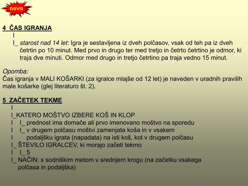 4 ČAS IGRANJA I I_ starost nad 14 let:Igra je sestavljena iz dveh polčasov, vsak od teh pa iz dveh četrtin po 10 minut.Med prvo in drugo ter med tretjo in četrto četrtino je odmor, ki traja dve minuti.Odmor med drugo in tretjo četrtino pa traja vedno 15 minut. Opomba: Čas igranja v MALI KOŠARKI (za igralce mlajše od 12 let) je naveden v uradnih pravilih male košarke (glej literaturo št. 2). 5 ZAČETEK TEKME I I_KATERO MOŠTVO IZBERE KOŠ IN KLOP I I_ prednost ima domače ali prvo imenovano moštvo na sporedu I I_ v drugem polčasu moštvi zamenjata koša in v vsakem I podaljšku igrata (napadata) na isti koš, kot v drugem polčasu I_ŠTEVILO IGRALCEV, ki morajo začeti tekmo I I_ 5 I_ NAČIN: s sodniškim metom v srednjem krogu (na začetku vsakega polčasa in podaljška)
