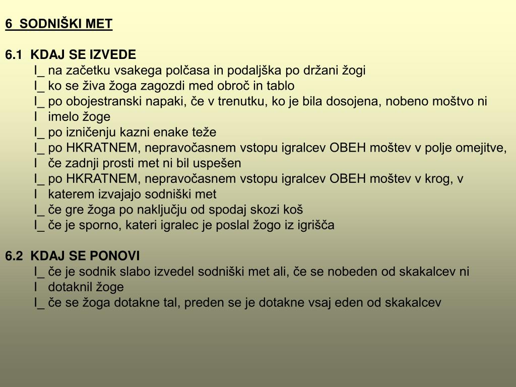 6 SODNIŠKI MET 6.1 KDAJ SE IZVEDE I_ na začetku vsakega polčasa in podaljškapo držani žogi I_ ko se živa žoga zagozdi med obroč in tablo I_ po obojestranski napaki, če v trenutku, ko je bila dosojena, nobeno moštvo ni I imelo žoge I_ po izničenju kazni enake teže I_ po HKRATNEM, nepravočasnem vstopu igralcev OBEH moštev v polje omejitve, I če zadnji prosti met ni bil uspešen I_ po HKRATNEM, nepravočasnem vstopu igralcev OBEH moštev v krog, v I katerem izvajajo sodniški met I_ če gre žoga po naključju od spodaj skozi koš I_ če je sporno, kateri igralec je poslal žogo iz igrišča 6.2 KDAJ SE PONOVI I_ če je sodnik slabo izvedel sodniški met ali, če se nobeden od skakalcev ni I dotaknil žoge I_ če se žoga dotakne tal, preden se je dotakne vsaj eden od skakalcev