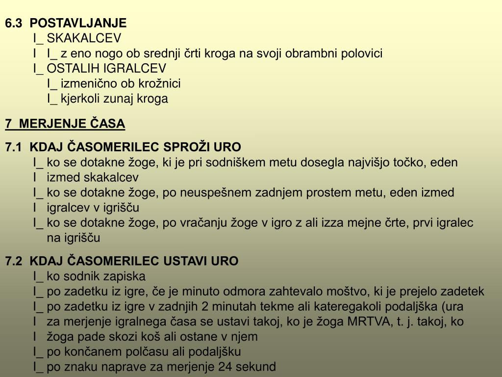 6.3 POSTAVLJANJE I_ SKAKALCEV I I_ z eno nogo ob srednji črti kroga na svoji obrambni polovici I_ OSTALIH IGRALCEV I_ izmenično ob krožnici I_ kjerkoli zunaj kroga 7 MERJENJE ČASA 7.1 KDAJ ČASOMERILEC SPROŽI URO I_ ko se dotakne žoge, ki je pri sodniškem metu dosegla najvišjo točko, eden I izmed skakalcev I_ ko se dotakne žoge, po neuspešnem zadnjem prostem metu, eden izmed I igralcev v igrišču I_ ko se dotakne žoge, po vračanju žoge v igro z ali izza mejne črte, prvi igralec na igrišču 7.2 KDAJ ČASOMERILEC USTAVI URO I_ ko sodnik zapiska I_ po zadetku iz igre, če je minuto odmora zahtevalo moštvo, ki je prejelo zadetek I_ po zadetku iz igre v zadnjih 2 minutah tekme ali kateregakoli podaljška (ura I za merjenje igralnega časa se ustavi takoj, ko je žoga MRTVA, t. j. takoj, ko I žoga pade skozi koš ali ostanev njem I_ po končanem polčasu ali podaljšku I_ po znaku naprave za merjenje 24 sekund