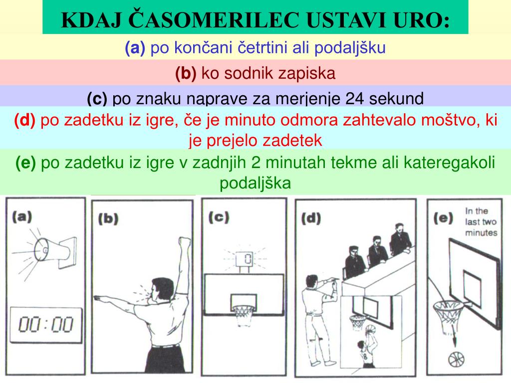 KDAJ ČASOMERILEC USTAVI URO: (a) po končani četrtini ali podaljšku (b) ko sodnik zapiska (c)po znaku naprave za merjenje 24 sekund (d)po zadetku iz igre, če je minuto odmora zahtevalo moštvo, ki je prejelo zadetek (e)po zadetku iz igre v zadnjih 2 minutah tekme ali kateregakoli podaljška