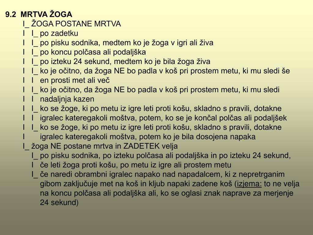 9.2 MRTVA ŽOGA I_ ŽOGA POSTANE MRTVA I I_ po zadetku I I_ po pisku sodnika, medtem ko je žoga v igri ali živa I I_ po koncu polčasa ali podaljška I I_ po izteku 24 sekund, medtem ko je bila žoga živa I I_ ko je očitno, da žoga NE bo padla v koš pri prostem metu, ki mu sledi še I I en prosti met ali več I I_ ko je očitno, da žoga NE bo padla v koš pri prostem metu, ki mu sledi I I nadaljnja kazen I I_ ko se žoge, ki po metu iz igre leti proti košu, skladno s pravili, dotakne I I igralec kateregakoli moštva, potem, ko se jekončal polčas ali podaljšek I I_ ko se žoge, ki po metu iz igre leti proti košu, skladno s pravili, dotakne I igralec kateregakoli moštva, potem ko je bila dosojenanapaka I_ žoga NE postane mrtva in ZADETEK velja I_ po pisku sodnika, po izteku polčasa ali podaljška in po izteku 24 sekund, I če leti žoga proti košu, po metu iz igre ali prostemmetu I_ če naredi obrambni igralec napako nad napadalcem, ki z nepretrganim gibom zaključuje met na koš in kljub napaki zadene koš (izjema: to ne velja na koncu polčasa ali podaljška ali, ko se oglasi znak naprave za merjenje 24 sekund)