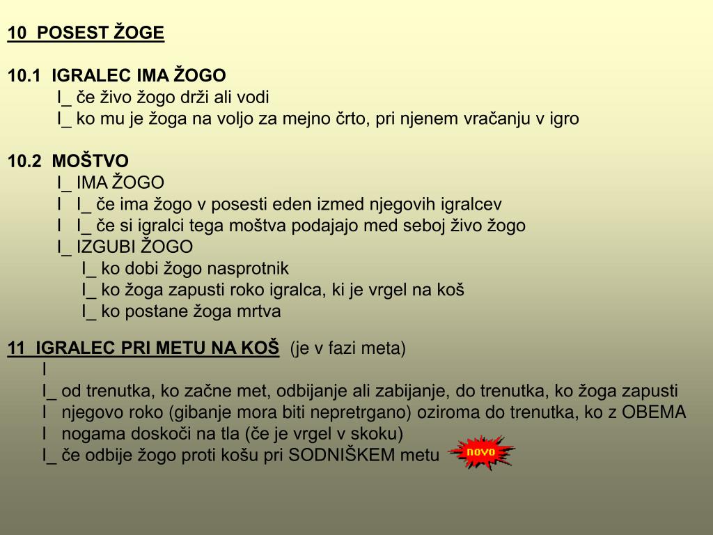 8 IGRANJE Z ŽOGO 8.1 PRAVILNO I_ vodenje I_ kotaljenje I_ podajanje in lovljenje I_ metanje na koš I_ odbijanje 8.2 NEPRAVILNO I_ vodenje z obema rokama hkrati I_ nošenje (korakanje z žogo) I_ igranje s pestjo I_ namerno igranje z nogo 9 POLOŽAJ (STATUS) ŽOGE 9.1 ŽIVA ŽOGA I_ ko se jo pravilno dotakne eden izmed skakalcevpri sodniškem metu I_ ko je žoga na voljo izvajalcu prostega meta I_ ko je na voljo igralcu, ki jo bo vrnil v igro