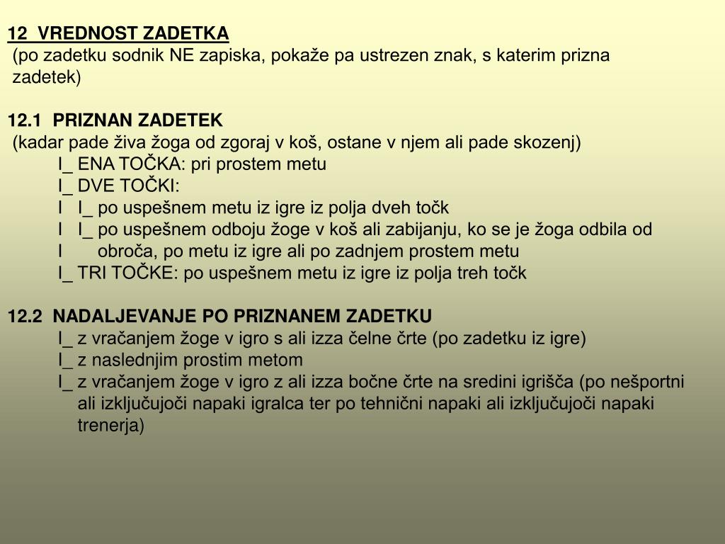 12 VREDNOST ZADETKA (po zadetku sodnik NE zapiska, pokaže pa ustrezen znak, s katerim prizna zadetek) 12.1 PRIZNAN ZADETEK (kadar pade živa žoga od zgoraj v koš, ostane v njem ali pade skozenj) I_ ENA TOČKA: pri prostem metu I_ DVE TOČKI: I I_ po uspešnem metu iz igre iz polja dveh točk I I_ po uspešnem odboju žoge v koš ali zabijanju, ko se je žoga odbila od I obroča, po metu iz igre ali po zadnjem prostem metu I_ TRI TOČKE: po uspešnem metu iz igre iz polja treh točk 12.2 NADALJEVANJE PO PRIZNANEM ZADETKU I_ z vračanjem žoge v igro s ali izza čelne črte (po zadetku iz igre) I_ z naslednjim prostim metom I_ z vračanjem žoge v igro z ali izza bočne črte na sredini igrišča (po nešportni ali izključujoči napaki igralca ter po tehnični napaki ali izključujoči napaki trenerja)