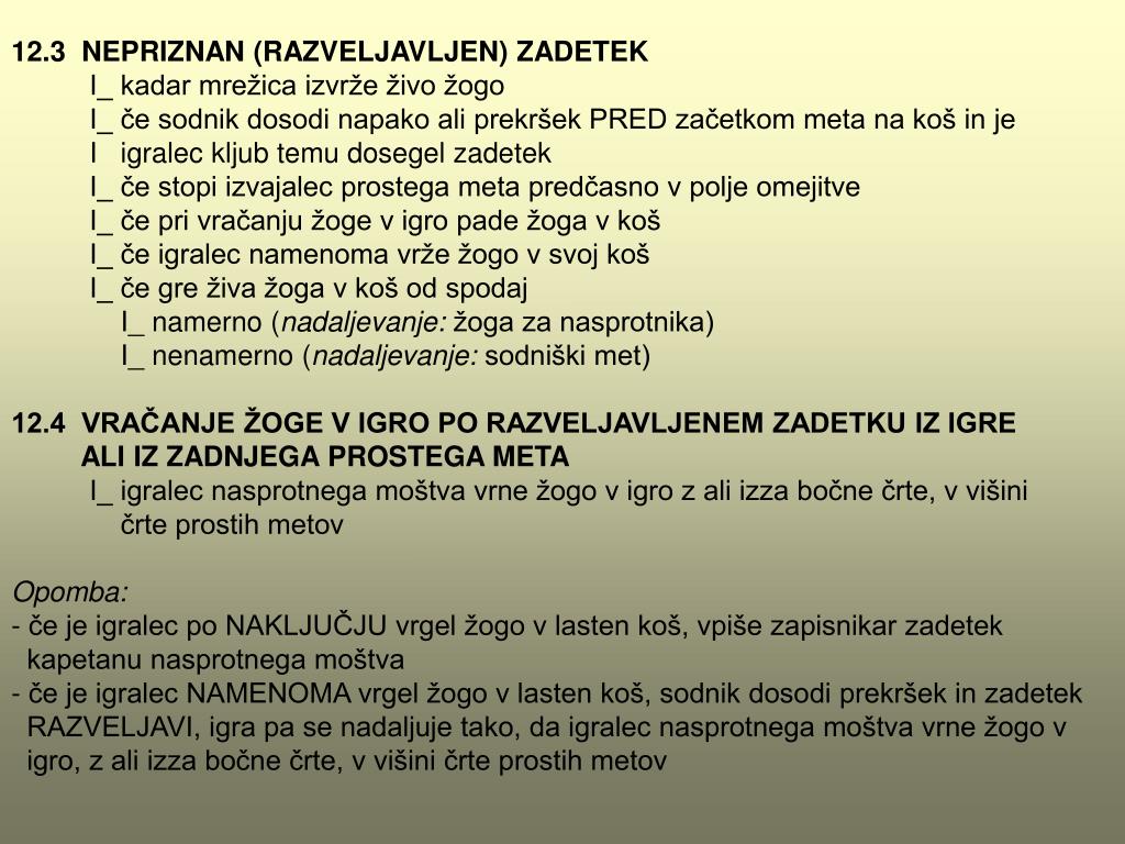 12.3 NEPRIZNAN (RAZVELJAVLJEN) ZADETEK I_ kadar mrežica izvrže živo žogo I_ če sodnik dosodi napako ali prekršek PRED začetkom meta na koš in je I igralec kljub temu dosegel zadetek I_ če stopi izvajalec prostega meta predčasno v polje omejitve I_ če pri vračanju žoge v igro pade žoga v koš I_ če igralec namenoma vrže žogo v svoj koš I_ če gre živa žoga v koš od spodaj I_ namerno (nadaljevanje: žoga za nasprotnika) I_ nenamerno (nadaljevanje: sodniški met) 12.4 VRAČANJE ŽOGE V IGRO PO RAZVELJAVLJENEM ZADETKU IZ IGRE ALI IZ ZADNJEGA PROSTEGA META I_ igralec nasprotnega moštva vrne žogo v igro z ali izza bočne črte, v višini črte prostih metov Opomba: - če je igralec po NAKLJUČJU vrgel žogo v lasten koš, vpiše zapisnikar zadetek kapetanu nasprotnega moštva - če je igralec NAMENOMA vrgel žogo v lasten koš, sodnik dosodi prekršek in zadetek RAZVELJAVI, igra pa se nadaljuje tako, da igralec nasprotnega moštva vrne žogo v igro, z ali izza bočne črte, v višini črte prostih metov