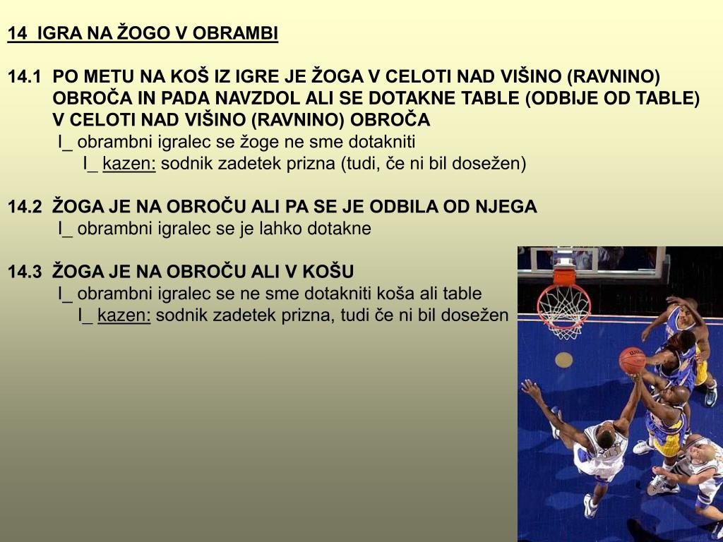 14 IGRA NA ŽOGO V OBRAMBI 14.1 PO METU NA KOŠ IZ IGRE JE ŽOGA V CELOTI NAD VIŠINO (RAVNINO) OBROČAIN PADA NAVZDOL ALI SE DOTAKNE TABLE (ODBIJE OD TABLE) V CELOTI NAD VIŠINO (RAVNINO) OBROČA I_ obrambni igralec se žoge ne sme dotakniti I_ kazen: sodnik zadetek prizna (tudi, če ni bil dosežen) 14.2 ŽOGA JE NA OBROČU ALI PA SE JE ODBILA OD NJEGA I_ obrambni igralec se je lahko dotakne 14.3 ŽOGA JE NA OBROČU ALI V KOŠU I_ obrambni igralec se ne sme dotakniti koša ali table I_ kazen: sodnik zadetek prizna, tudi če ni bil dosežen